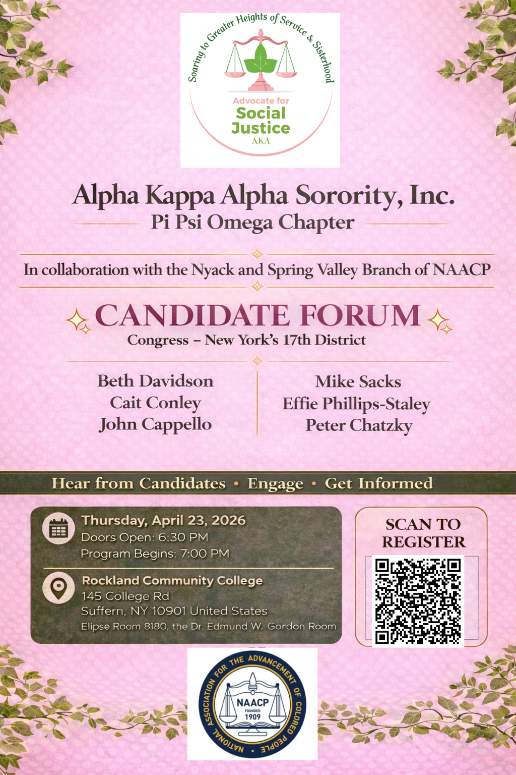 The Alpha Kappa Alpha Sorority, Inc., Pi Psi Omega Chapter, in partnership with the Spring Valley NAACP will be hosting a Candidate Forum with those running for Congress in the NY-17 District. Come to learn more about the candidates on April 23rd at 6:30 pm.